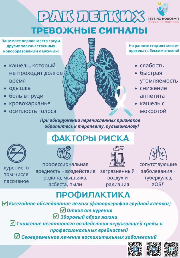 Рак лёгкого остаётся одной из самых частых причин смертности среди онкологических заболеваний как в России, так и во всём мире. Каждый год в нашей стране выявляется почти 700 тысяч новых случаев. Только в Нижегородской области в 2024 году зарегистрировано 1495 пациентов с впервые выявленным раком лёгкого. Эти цифры подтверждают: профилактика и ранняя диагностика остаются ключевыми в борьбе с этим заболеванием. Что же об этой проблеме говорят онкологи? Курение главный фактор риска По данным Всемирной организации здравоохранения, до 85 % случаев рака лёгкого связано с курением. Табачный дым содержит десятки канцерогенных соединений, которые повреждают клетки дыхательных путей и способствуют развитию опухоли. Курение остаётся основной причиной этого заболевания, но, к сожалению, многие продолжают недооценивать его опасность. Опасность представляет и пассивное курение длительное вдыхание табачного дыма, даже если человек сам не курит. Отказ от вредной привычки значительно снижает риск развития рака. Уже через пять лет после прекращения курения вероятность заболевания сокращается почти вдвое, а через 10–15 лет приближается к уровню некурящих. Современная медицина располагает возможностью провести генетическое тестирование анализ, выявляющий мутации в генах, (EGFR, ALK, ROS, MET) связанных с хорошей чувствительностью к лечению определенными препаратами. Эти данные позволяют составить индивидуальный план наблюдения и лечения. Влияние экологии и условий труда Важным фактором риска остаются вредные производственные условия и загрязнение воздуха. Люди, работающие на предприятиях, где присутствует контакт с пылью, асбестом, химическими веществами или выхлопными газами, находятся в группе повышенного риска. Жителям крупных промышленных регионов, в том числе Нижегородской области, стоит особенно внимательно относиться к своему здоровью. Регулярные профилактические осмотры и использование средств защиты дыхательных путей простые, но эффективные меры безопасности. Скрининг шанс на раннее выявление Ранняя диагностика играет решающую роль. Самым информативным методом выявления опухоли на ранней стадии сегодня считается низкодозная компьютерная томография (НДКТ) органов грудной клетки. Это исследование безболезненно, занимает всего несколько минут и позволяет обнаружить опухоль задолго до появления первых симптомов. К сожалению, кашель, боли или одышка появляются уже тогда, когда болезнь находится в запущенной стадии. По международным данным, регулярное проведение НДКТ у людей из группы риска снижает смертность от рака лёгкого на 20–30 %. Профилактика залог здоровья Рак лёгкого болезнь, развитие которой во многом зависит от самого человека. Отказ от курения, активный образ жизни, здоровое питание, контроль состояния лёгких и регулярные профилактические осмотры позволяют существенно снизить вероятность заболевания. Жители Нижегородской области могут пройти низкодозную компьютерную томографию лёгких бесплатно по полису ОМС в Институте клинической онкологии. Онкологи всегда призывают пациентов не ждать появления симптомов, а заботиться о себе заранее. Рак лёгкого, выявленный на ранней стадии, сегодня успешно лечится. Главное не упустить время. |